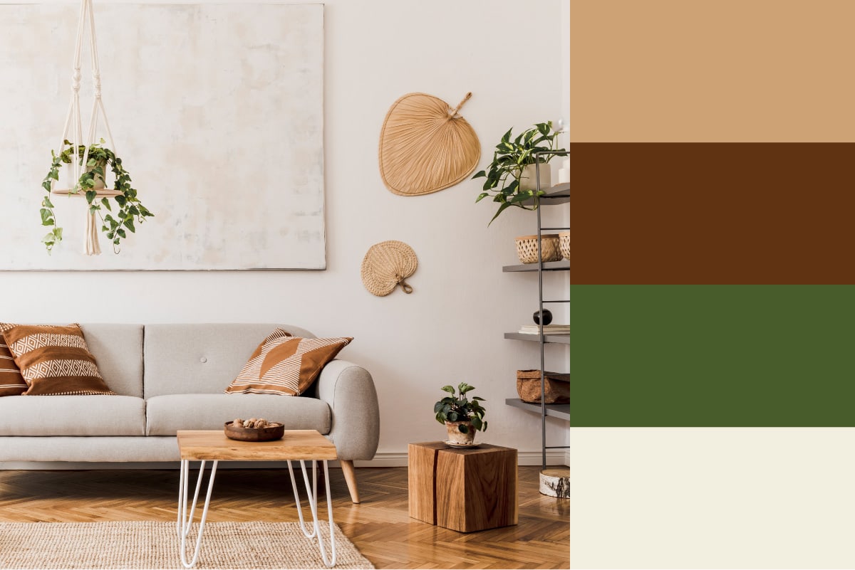 Start with a warm-toned wall color, a neutral couch, and decor and accessories in a few earthy colors.